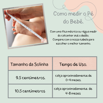 - Disponível em três tamanhos, que atendem bebês até 4 meses. Recomendamos medir o pezinho com régua ou fita métrica para escolher o tamanho ideal.